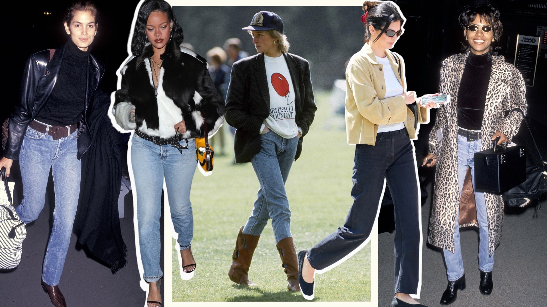 To kick things off, we have Cindy Crawford back in 1991, wearing light-wash cigarette jeans with a black leather blazer, a dark turtleneck sweater, and brown leather, pointed-toe Chelsea boots—the perfect complement to a dark chocolate-colored suede belt. The styling will work just as well today, especially considering that chocolate brown is a top color trend and leather blazers are a wardrobe classic on par with trench coats.